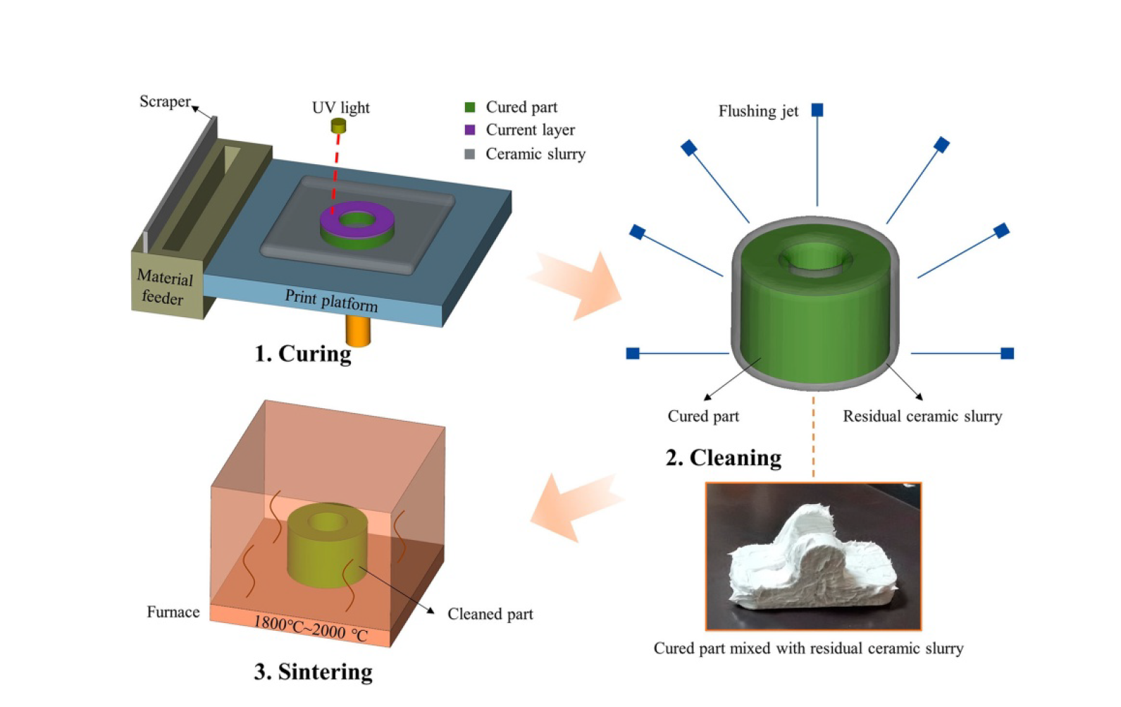 如圖中所示的光固化立體成型流程中,步驟二的清洗環(huán)節(jié)至關(guān)重要,因?yàn)槿魵埩籼沾蓾{料未能徹底清除,會(huì)增加部件的重量,并降低燒結(jié)部件的形狀精度和表面質(zhì)量。然而,對(duì)于清洗液沖洗射流無(wú)法觸及的孔洞、通道及其他復(fù)雜幾何形狀部位,清除殘留漿料就成了一項(xiàng)復(fù)雜甚至難以完成的任務(wù)。