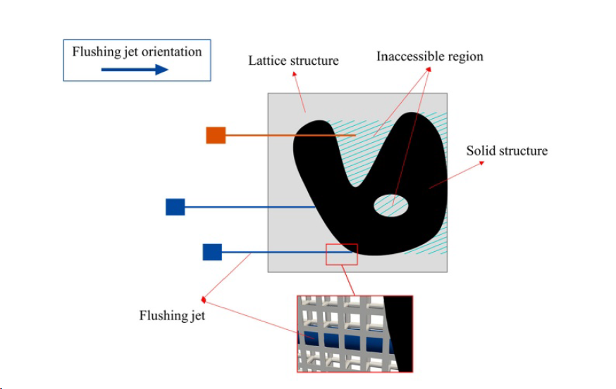 如圖所示,假設(shè)僅涉及單向沖洗射流,陰影區(qū)域代表無(wú)法觸及的區(qū)域,因?yàn)闆_洗射流只能穿透晶格(灰色標(biāo)記)而無(wú)法穿透實(shí)體(黑色標(biāo)記)。因此,在對(duì)結(jié)構(gòu)進(jìn)行優(yōu)化時(shí),應(yīng)仔細(xì)考慮確保沖洗射流能夠到達(dá)所有需要清洗的區(qū)域。