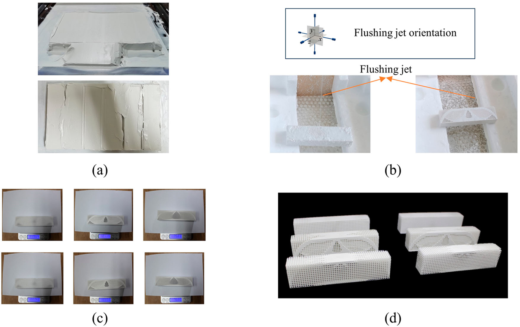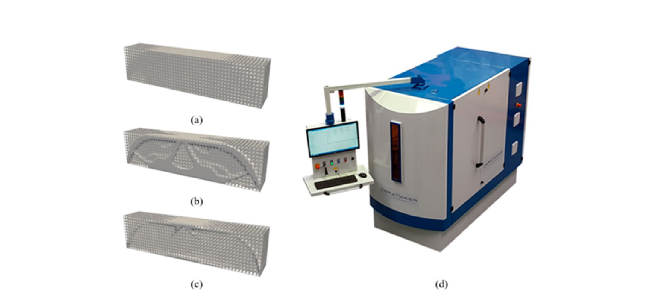 上圖展示了對(duì)三組優(yōu)化的三維MBB梁模型進(jìn)行了增材制造和清洗測(cè)試,以驗(yàn)證所提出方法的有效性。圖為總結(jié)構(gòu)尺寸為120 mm x30mm x20 mm的三維MBB梁模型,分別為(a)梯度點(diǎn)陣填充設(shè)計(jì)、(b)不考慮沖刷可達(dá)性約束的LSHS設(shè)計(jì)和(c)考慮沖刷可達(dá)性約束的LSHS設(shè)計(jì),使用 3D打印機(jī)C900 Flex (3D Ceram, France)打印優(yōu)化結(jié)果。