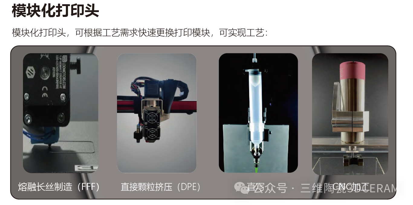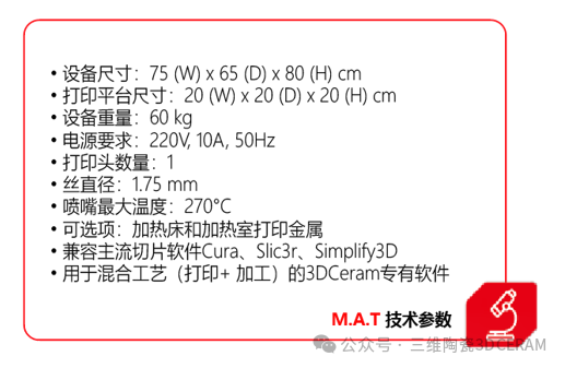 最新M.A.T 多工藝一體3D打印機(jī),適用于先進(jìn)陶瓷(碳化硅、氧化鋁、氧化鋯)和金屬材料(不銹鋼、鈦、銅),擁有獨(dú)特的“coreXY“運(yùn)動(dòng)系統(tǒng),確保準(zhǔn)確性和穩(wěn)定性;高性能擠出系統(tǒng),防止特種絲材斷裂并提供精確線材引導(dǎo);嵌入式冷卻系統(tǒng),獲得最可靠的打印效率;熱管理打印腔室,適配打印高性能打印材料;除此之外,還可用來(lái)裝載較重模塊的加固結(jié)構(gòu)。